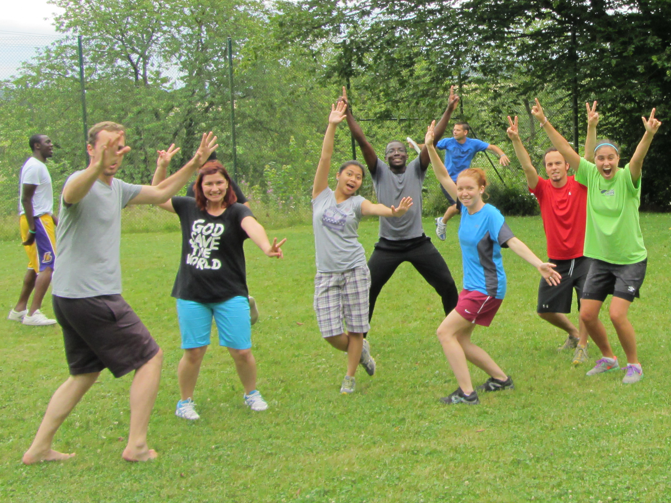 A FEW of us getting excited about playing Ultimate Frisbee (there were at least 20 other people playing with us as well)!